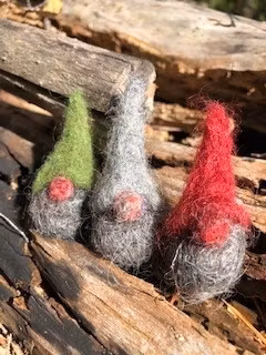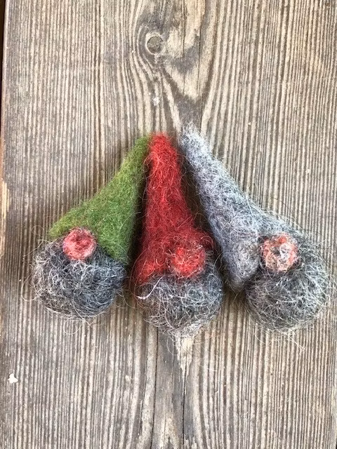 Tre små handtovade vättar i ull med olika färg på sina luvor. Supersöta att tex sätta på en krans, sätta snöre i dem och hänga i granen eller på en "gå-bort-present" eller varför inte sätta en i hyacinten eller julgruppen.