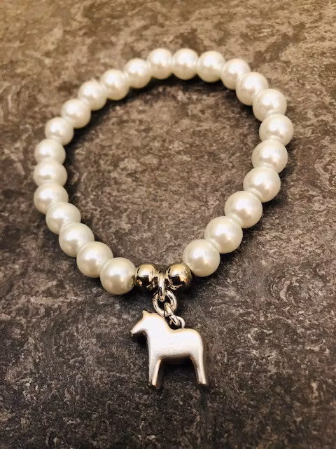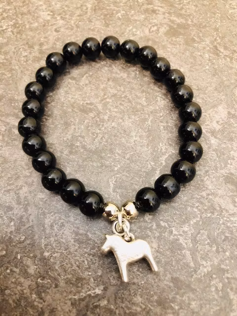 Vackert armband i 8 mm stora vaxade glaspärlor med vacker dalahäst i metall. Finns i 3 olika färger - svart, vitt, och rosa.