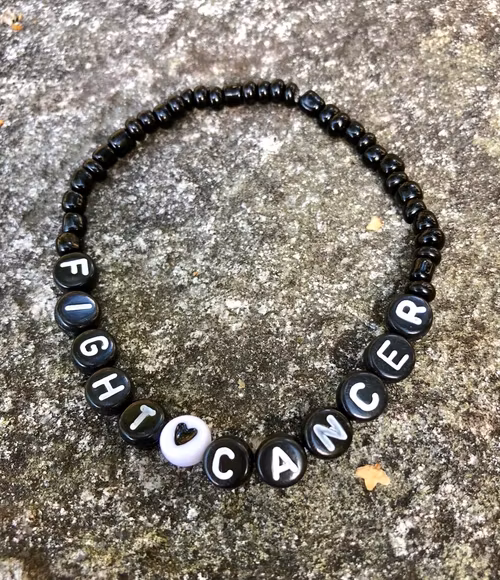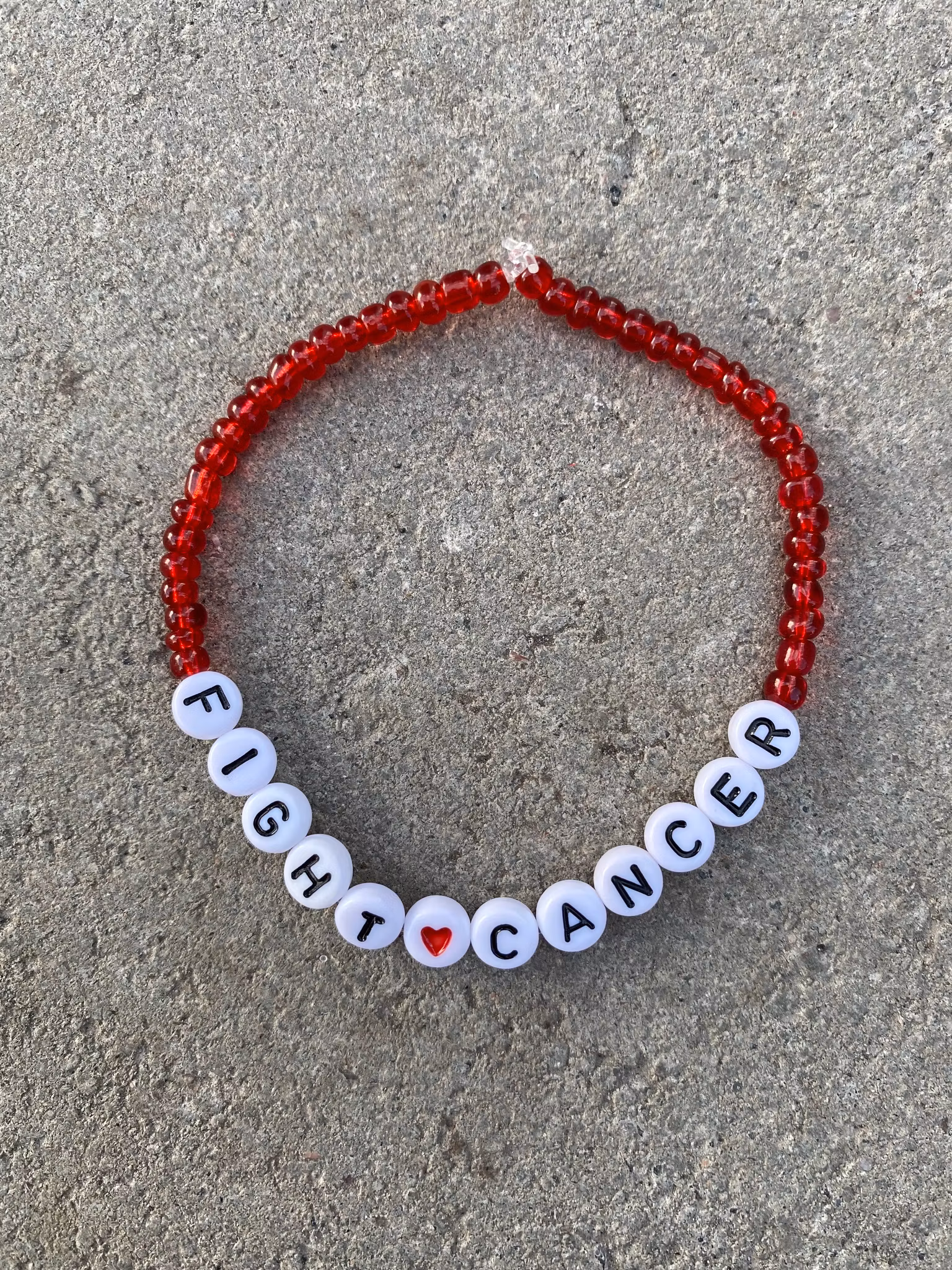Handgjort armband i tjeckiska glaspärlor med texten FIGHT CANCER och hjärta. Finns i barn, dam och herrstorlek. Levereras i en vacker organzapåse. Elastiskt.